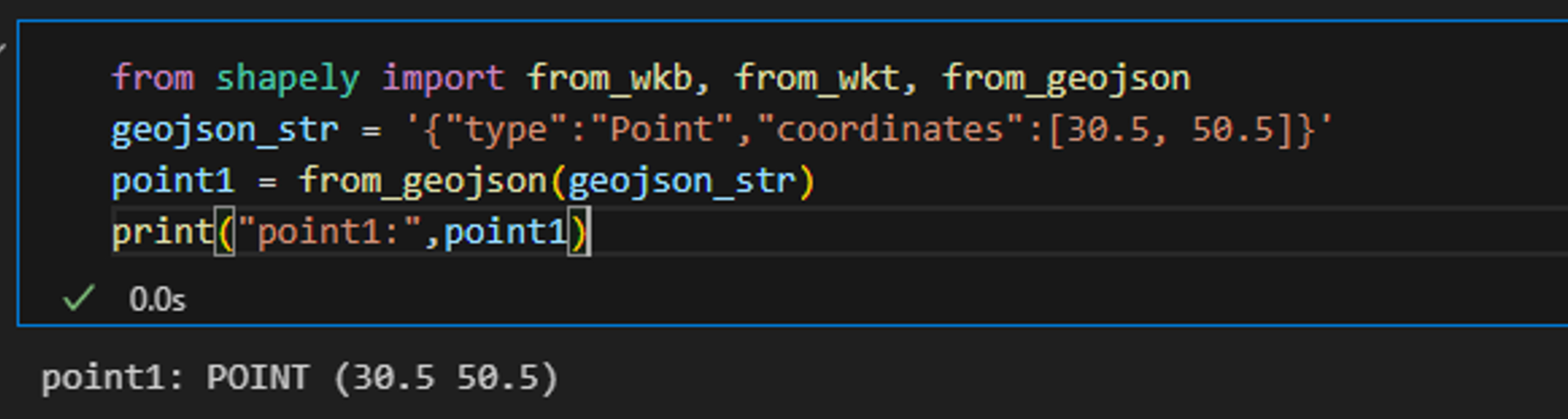 Görsel: from_geojson() fonksiyonu ile GeoJSON formatındaki bir nokta verisinin Shapely Point nesnesine dönüştürülmesi