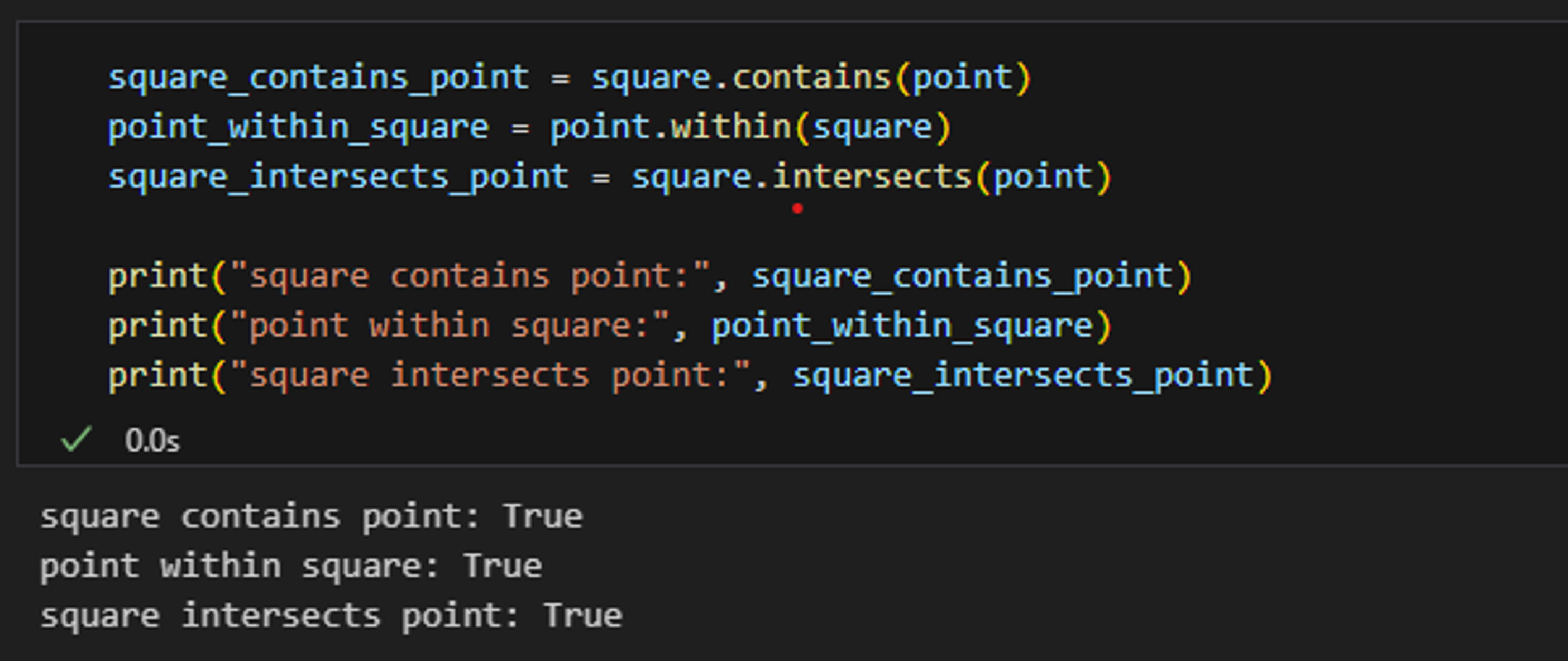 Shapely, geometriler arasındaki ilişkileri test etmek için predicate (önermelik) fonksiyonları sunar. Örnekler: